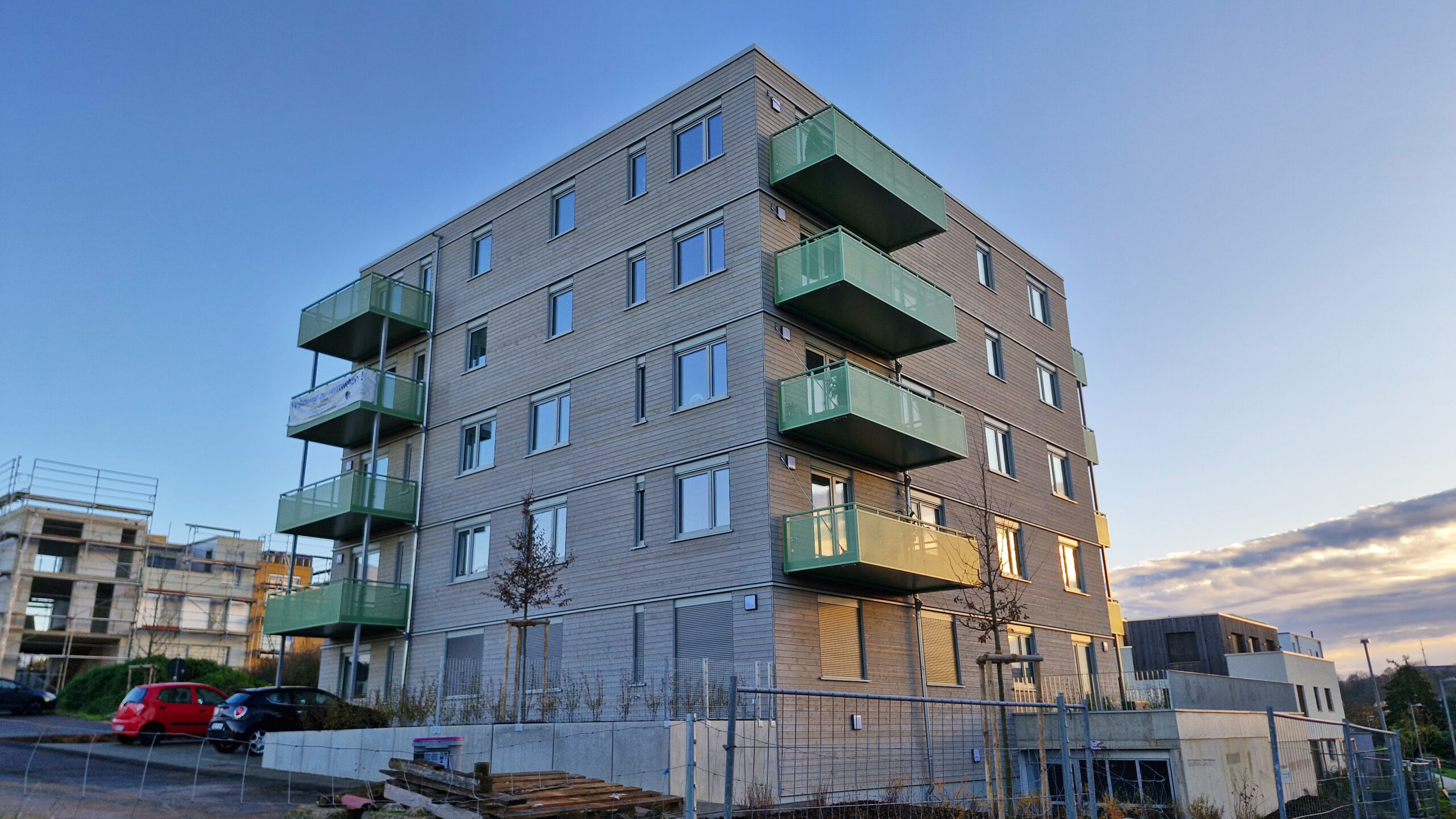 Die Bewohner erwartet hier eine hochwertige, energetisch optimierte Immobilie mit großzügigen Balkonen bzw. Terrassen, PKW-Stellplätzen und Kellerräumen. Der Holzhybridbau ist mit einer Holzfassade, drei Luftwasserwärmepumpen und einer PV-Anlage auf dem begrünten Dach ausgestattet.